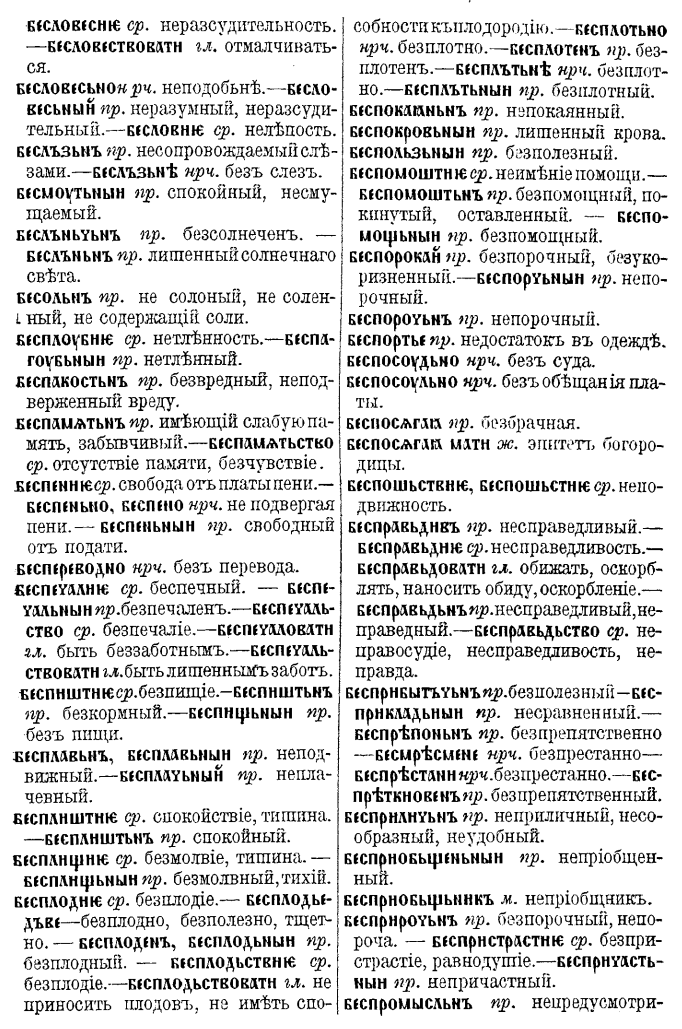 Имеет значение отсутствия какого-то качества. Примеры слов с приставкой из старославянского: БЕС - BJAJS БЕС - системный алгоритм сдвига, сформированный из световой сети, который является начальным этапом перетекания по спектру. Еще говорят: бес попутал. Это событийный сдвиг. Слово "быть" имело вариант написания через ѣ.
