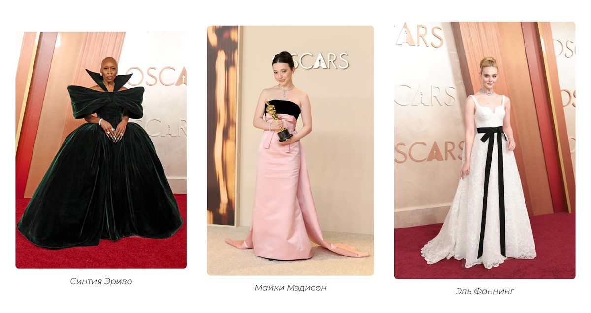 2 марта киноакадемия объявила победителей Оскара-2025! Помимо номинаций, мы внимательно изучили наряды звезд с красной дорожки. О самых красивых образах и актуальных трендах рассказываем вам. Уже несколько сезонов банты украшают наряды на ковровых дорожках. Сейчас, по сравнению с прошлыми сезонами, банты стали утонченнее и минималистичнее: аккуратно повязанные на платьях Майки Медисон и Эль Фанниг. Бант напоминает форма гипертрофированных плеч на платье Синтии Эриво. На нашем сайте вы также найдете платье со съемным бантом. Мужчины выбрали для себя костюмы в трендовых оттенках сезона: Тимоти Шаламе – сливочный, Эндрю Гарфилд – шоколадный оттенок. В его образе плотная костюмная ткань сочетается со струящейся рубашкой. Колман Доминго выбрал костюм в насыщенном красном оттенке. Среди мужских образов мы также наблюдаем тренд на приталенные силуэты. Чтобы воссоздать образы, вдохновленные аутфитами с дорожки, присмотритесь к жакету и юбке в сливочном оттенке для образа Тимоти Шаламе, красном