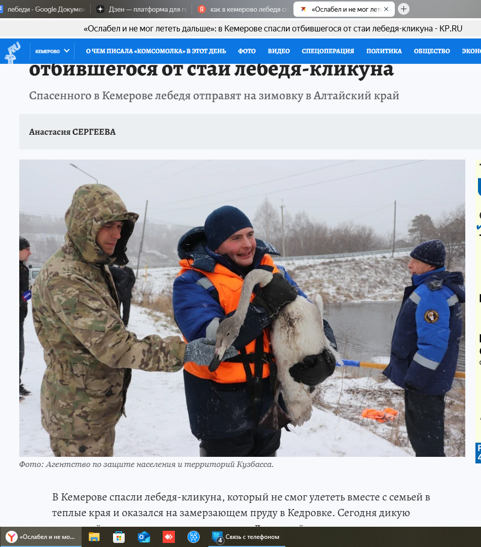 В поселке Кедровка нашей области поздней осенью на одноименной реке обнаружили лебедя. Заводь реки уже покрывалась льдом, оставляя бедной птице всё меньше места. Наши спасатели организовали целую операцию по спасению кликуна, с трудом отловили птицу и отправили в Алтайский край. В заказник лебедь сразу не попал по причине сломанного крыла, в феврале обещали подсадить его к сородичам. Надеюсь, у него всё хорошо.
