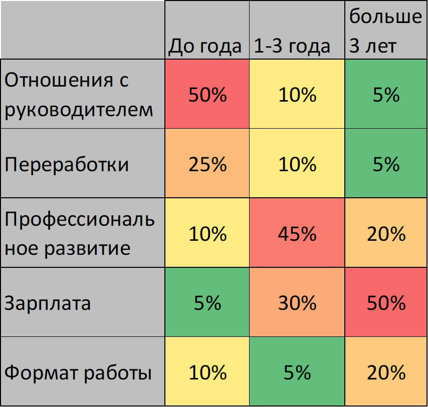 ПРИГЛАШАЮ ОТСЛЕЖИВАТЬ НАС В ТЕЛЕГРАМ Еще один инструмент анализа текучести персонала. Напомню, на прошлой неделе мы показывали Матрицу текучести – делим текучесть на желательную и нежелательную, смотрим в разрезе стажа и выделяем «хорошую» и «плохую» текучесть. Причины увольнений собирают многие (в прошлом году я обратился с вопросом к HR-аналитикам, с чего они начнут разрабатывать план по удержанию персонала, на первом месте по числу упоминаний оказался «анализ причин увольнений» - см. Удержание персонала – с чего начать ), но не все смотрят причины в разрезе стажа. На диаграмме я показал причины в разрезе стажа и указал % от суммы по столбцу. Т.е. 50 % сотрудников, уволившихся, не отработав года, указывают в качестве причины увольнения не сложившиеся отношения с руководителем, среди тех, кто увольняется в промежутке 1-3 года, топ причины – отсутствие профессионального развития, и у ветеранов топ причина – зарплата. Это данные реальной компании, я только оставил самые ключевые при