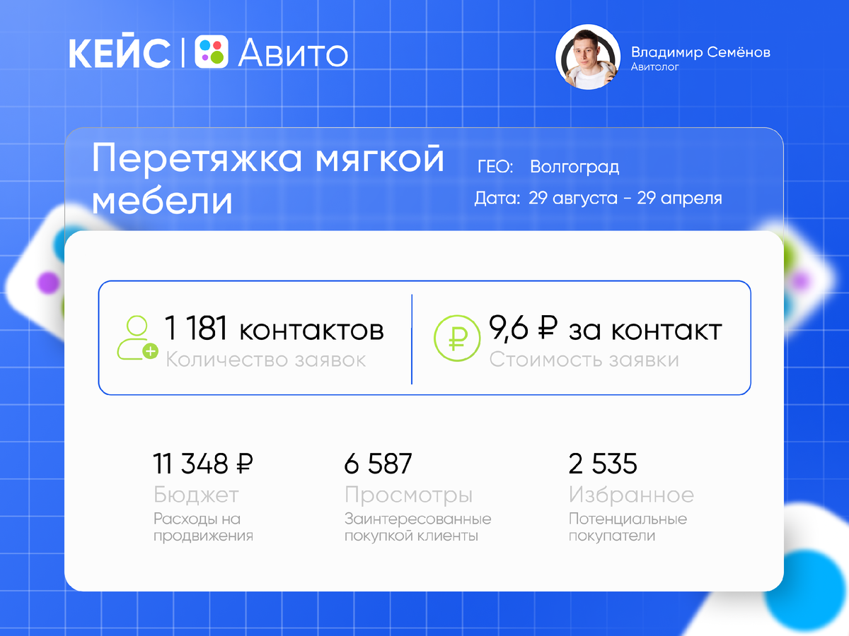 Этот кейс посвящен продвижению услуг по перетяжке мебели на платформе Авито. Перетяжка мебели — это востребованная услуга среди людей, желающих обновить интерьер и продлить жизнь любимым предметам интерьера. Цель проекта: Увеличение количества клиентов и улучшение узнаваемости услуги среди целевой аудитории. За восемь месяцев совместной работы с партнером нам удалось добиться впечатляющих результатов: - Бюджет: 11 350 рублей - Просмотры: 6 587 (стоимость просмотра — 1,7 рубля) - Контакты: 1 181 (стоимость контакта — 9,6 рублей) Эти показатели наглядно демонстрируют эффективность стратегии продвижения на Авито. Чтобы достигнуть высоких показателей, был применён комплексный подход: 1. Мониторинг конкурентов. Изучение деятельности конкурентов позволило выявить наши сильные стороны и усилить позиции в рекламе. 2. Оптимизация текстов. Объявления были переписаны с учётом ключевых запросов пользователей. 3. Качественные фотографии. Использовались снимки, подчёркивающие высокое качество выпо