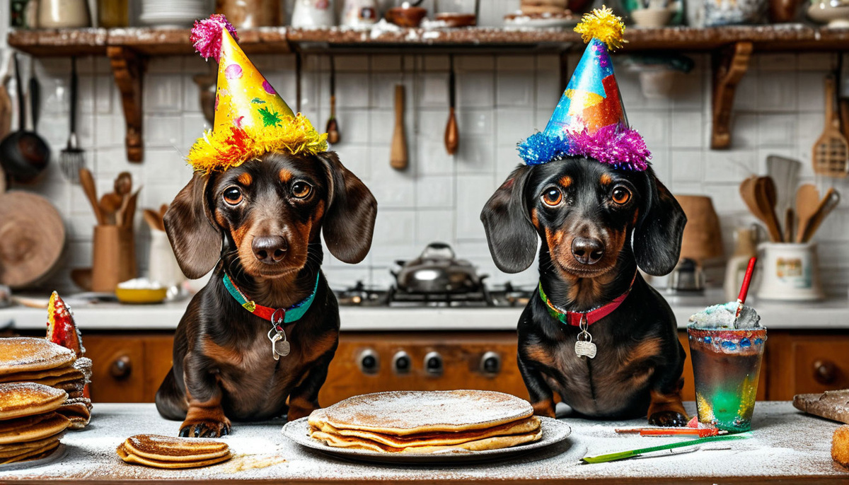 Жили-были две собаки, одну звали Рада, а другую Мила. Как-то с утра проснулись они и залезли на свой любимый подоконник, посмотрели в окно, а за окошком светило яркое солнце. Было время Масленицы, и таксы решили, что пора заняться чем-то особенным. Они спустились с подоконника и побежали на кухню. На кухне стоял большой стол, а на нём лежали все необходимые ингредиенты для приготовления теста. Хозяйка ушла по делам, оставив их одних, и тут Рада предложила: — Давай сами приготовим тесто для блинов! Это будет весело! — Надо подготовиться, — серьёзно заявила Мила. — Нам нужны настоящие поварские колпаки. И они побежали их искать в своем шкафу. — Вот эти с карнавала, — уверенно сказала Мила, вытаскивая яркие разноцветные колпаки. — Точно подойдут! И они надели веселые колпаки и торжественно вернулись на кухню. Они взялись за дело с энтузиазмом. Рада стояла на задних лапках и пыталась достать муку из пакета, а Мила помогала ей, держа пакет зубами. Мука посыпалась прямо на них, и вскоре обе