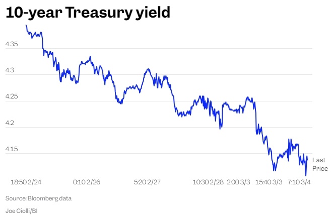 Рост фондового рынка после выборов Трампа был сведен на нет. Доходность акций и облигаций падает, поскольку тарифы Трампа вызывают опасения по поводу глобальной торговой войны. Это полная противоположность тому, что произошло в начале этого года, когда доходность резко выросла на фоне мнений о том, что пошлины подстегнут инфляцию. Инвесторы продают акции и активно скупают облигации после того, как во вторник вступили в силу пошлины Трампа. Это свидетельствует об изменении ситуации на рынке: трейдеры больше внимания уделяют влиянию тарифов на экономический рост, а не на вероятность нового витка инфляции. Вот краткий обзор событий дня: После вступления в силу пошлин, включая 25%-ную пошлину на товары из Канады и Мексики, а также дополнительную 10%-ную пошлину на китайские товары, доходность облигаций, которая изменяется обратно пропорционально ценам, снизилась. Покупка государственных облигаций оказалась противоположной тому, что изначально ожидалось на рынках. В начале года, когда Трамп
