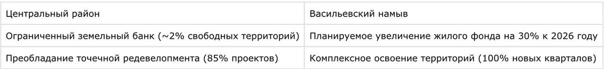 Дефицит свободных земель в Центральном районе ограничивает возможности для масштабных проектов, вынуждая девелоперов работать с точечными объектами. В отличие от этого, Васильевский намыв предлагает стратегию планомерного освоения территорий с синхронным развитием инфраструктуры.