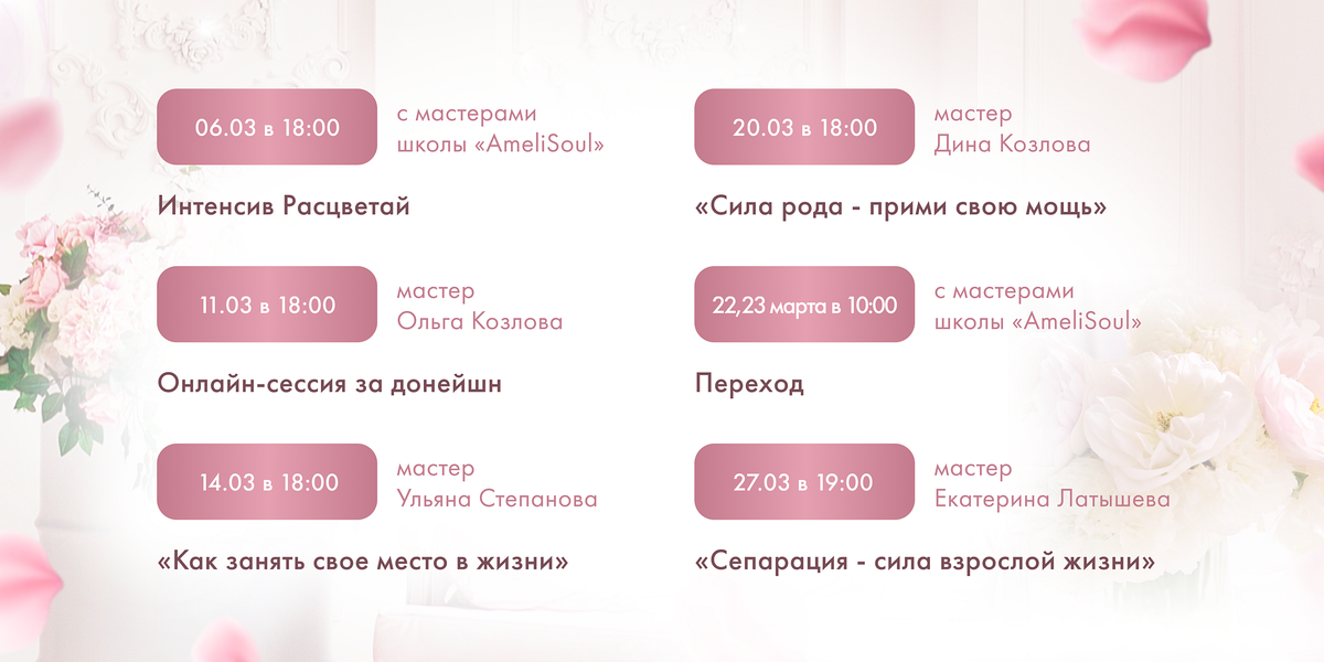 Март богат на интересные, познавательные и практические встречи с мастерами школы «AmeliSoul». Познакомьтесь с расписанием ⤵