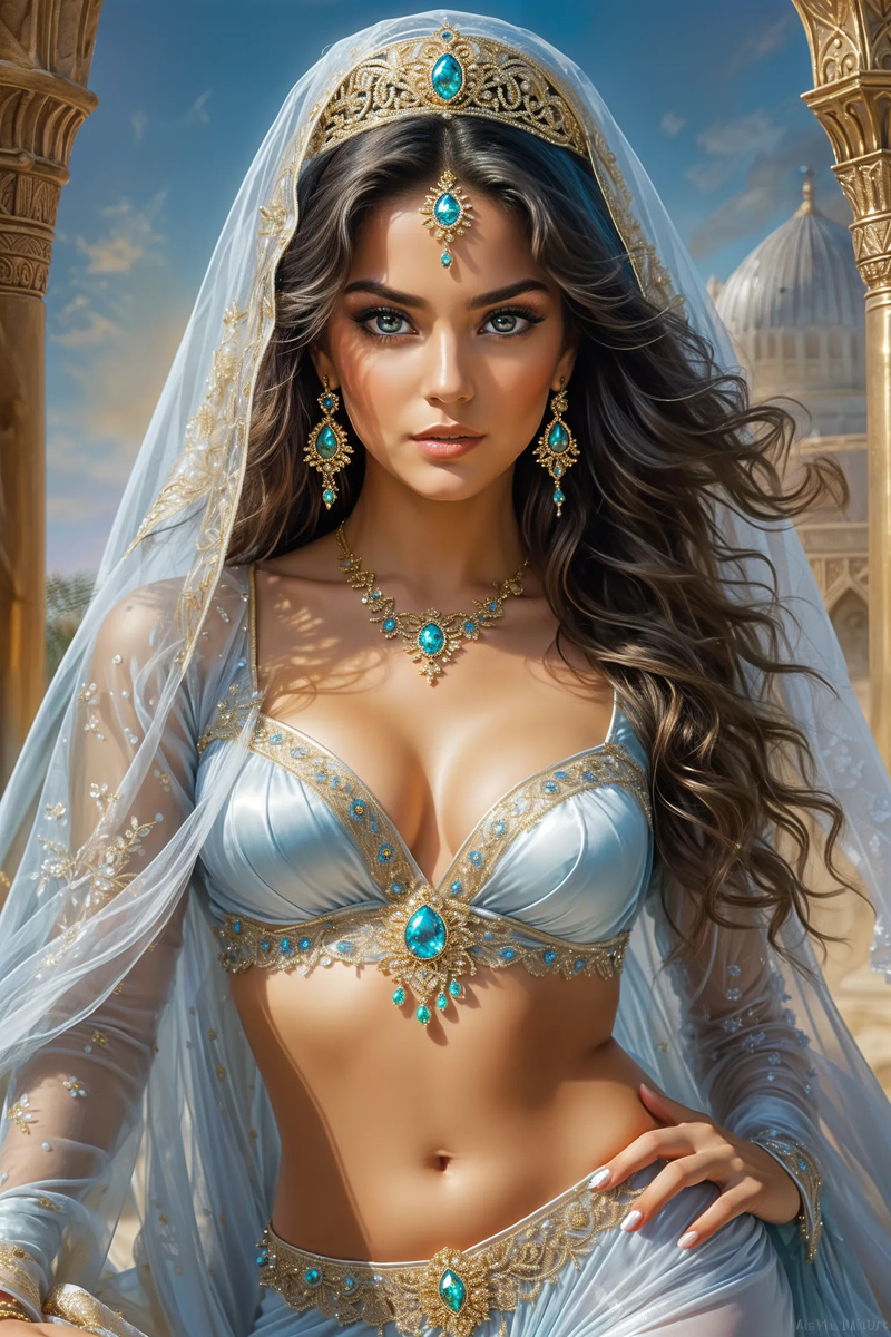 Гиперреалистичная цифровая картина потрясающе захватывает, завораживающий портрет персидской принцессы в покрывале с замысловатыми деталями, изображающий принцессу в сексуальном и полупрозрачном наряде, уделяя особое внимание ее очаровательному взгляду, высокодетализированным глазам, особому акценту на взгляде, высокодетализированным глазам, отражениям в зрачки, длинные волнистые волосы, добавляющие глубины ее загадочной красоте, сочетающей художественные стили Хосе Ройо, Бориса Вальехо, Джули Белл, Карна Гриффитса и Брайана Фруда, точную анатомию и центрированную симметрию. композиция, объемное освещение, захватывающая атмосфера, лучи, яркие цветовые отражения, высокое качество