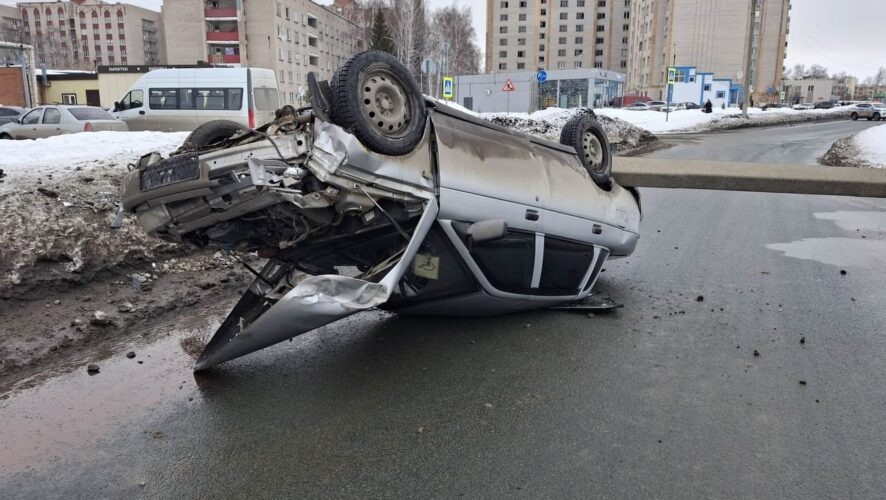 В Нижнекамске водитель «ВАЗа» влетел в столб и опрокинул легковушку на крышу