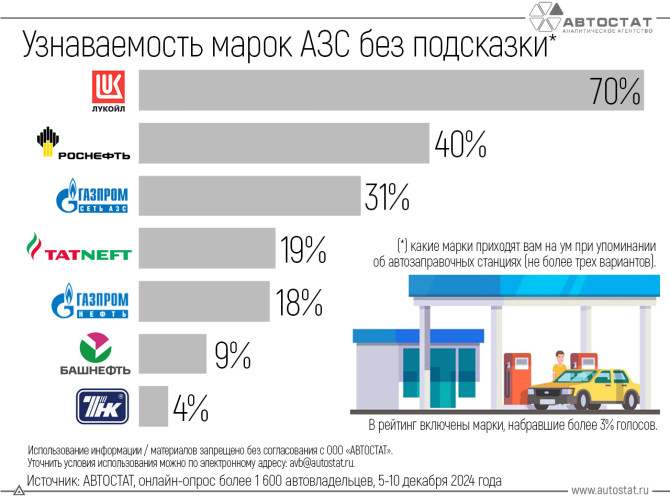 Возглавил рейтинг бренд «Лукойл», показатель которого составил 70%. Второе место заняла «Роснефть», набравшая 40%. Замкнул первую тройку «Газпром», результат которого равен 31%. Далее с примерно равными показателями следуют «Татнефть» и «Газпромнефть» (19% и 18% соответственно). Замыкают рейтинг самых узнаваемых брендов АЗС у россиян «Башнефть» (9%) и ТНК (4%). Источник: АВТОСТАТ Спасибо, что заглянули на наш канал! Мы рады делиться с вами интересными материалами, полезными советами и вдохновляющими идеями. Каждый ваш лайк и подписка — это огромная поддержка для нас и стимул создавать еще больше качественного контента. Подписывайтесь, чтобы не пропустить самые свежие новости и обновления, и обязательно ставьте лайки! Вместе мы можем сделать этот мир чуточку ярче и интереснее. Спасибо за ваше внимание и доверие!