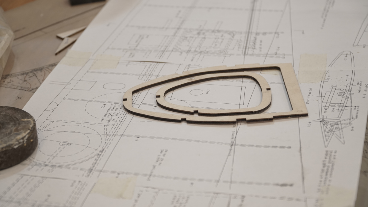 Фюзеляж состоит из тринадцати шпангоутов (семь из которых образует отбортовка листов обшивки), шести коротких лонжеронов и двенадцати стрингеров. Фюзеляж можно разделить на три отсека. Первый он же передний отсек фюзеляжа - в нем находится пулеметная установка с патронными ящиками, приборная доска, маслобак, кабина пилота. К шпангоуту , приболчены узлы крепления шасси, подкосов моторамы и переднего узла крыла. Сверху на этом же шпангоуте, установлены узлы крепления верхних балок моторамы и пулеметный постамент. В задней части отсека расположен бензобак и багажник летчика, доступ в который выполняется из кабины. Люк бензобака находится снизу фюзеляжа. Во втором отсеке фюзеляжа расположены аккумулятор, кислородные баллоны и радиостанция. Третий отсек(задний) соединен со вторым с помощью болтов. На заднем отсеке установлены узлы крепления киля и стабилизатора. Ну у нас по чертежу все намного проще. Режем шпангоуты на лазере, пилим рейки стрингеры и приступаем к сборке: для того чт