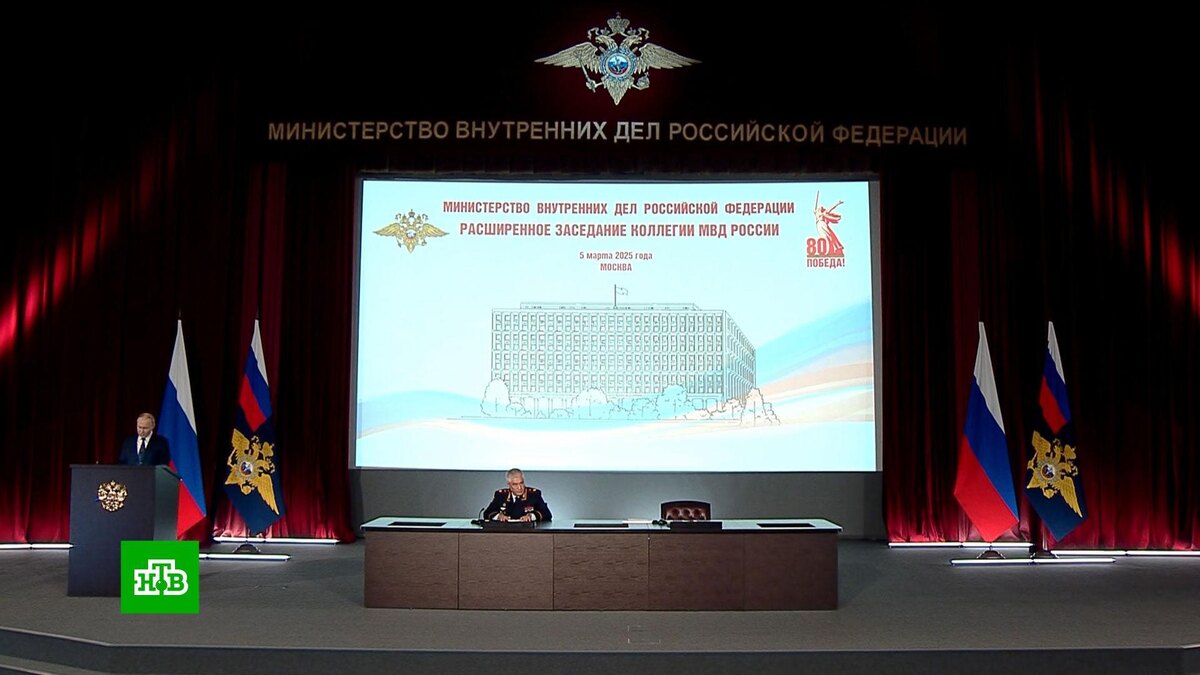 [ Смотреть видео на сайте НТВ ] Российские правоохранители должны учитывать все угрозы, возникающие в условиях навязанного стране конфликта, заявил сегодня Владимир Путин, выступая на расширенной коллегии МВД. Глава государства обрисовал основные задачи, стоящие перед органами внутренних дел. Это борьба с экстремизмом, оборотом наркотиков и киберпреступлениями. Выступая на коллегии, президент сначала поблагодарил полицейских за службу и призвал ни в коем случае не расслабляться и идти в ногу со временем, ведь преступники действуют по-новому, используя все возможности современных технологий. Особого, усиленного внимания требуют миграционные вопросы, и это понятно — незаконная миграция тянет за собой массу других нарушений закона в самых разных сферах общественной жизни. Владимир Путин, президент РФ: «Важной задачей органов внутренних дел остается борьба с экстремизмом. Национальная и религиозная нетерпимость, агрессивный, воинствующий радикализм — это угроза единству и сплоченности мног