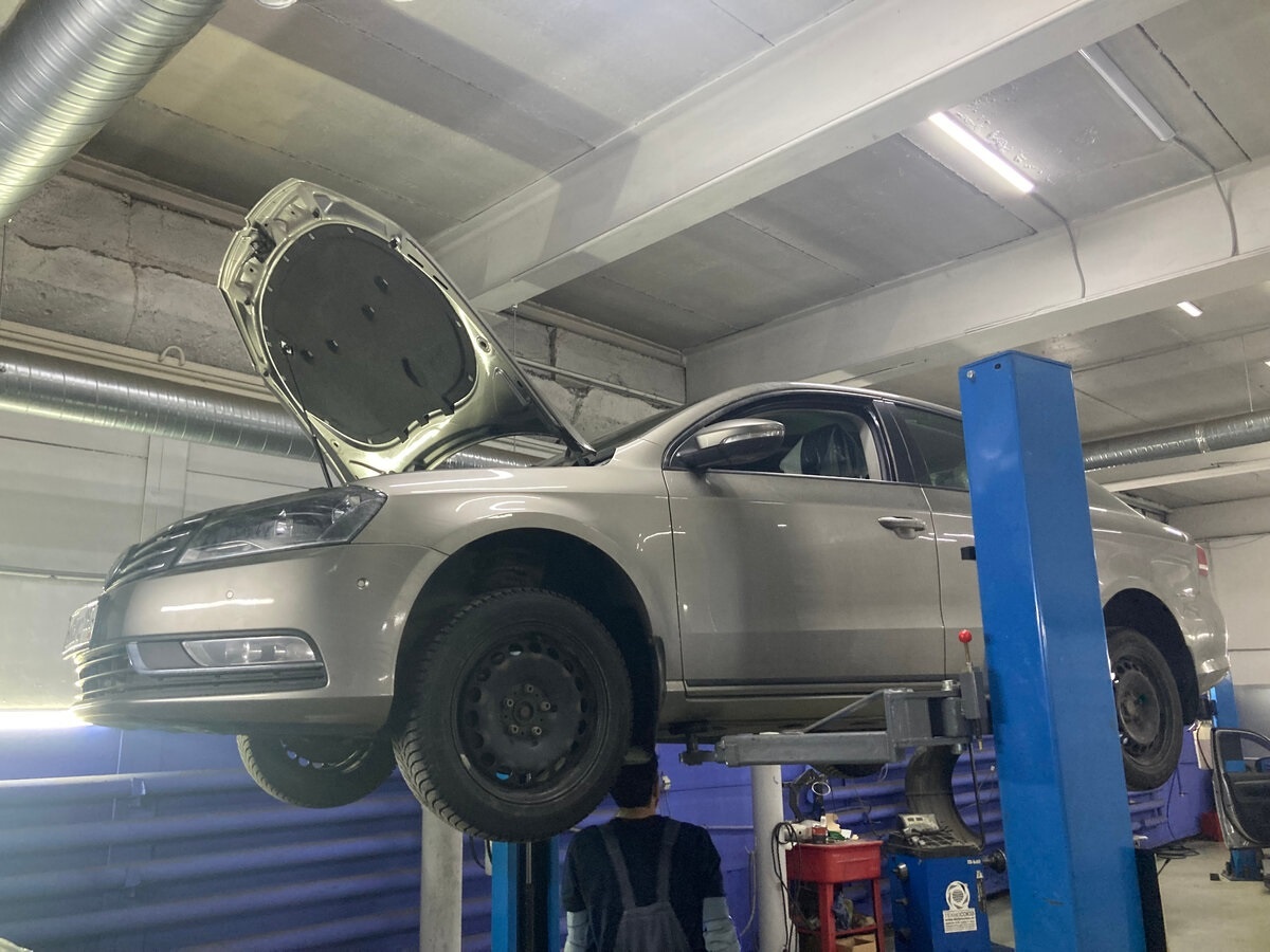 VOLKSWAGEN PASSAT 177 000 км При произведении планового ТО выявлена деформация фланца приемной части глушителя. Произведена замена на новый ремкомплект фланца.