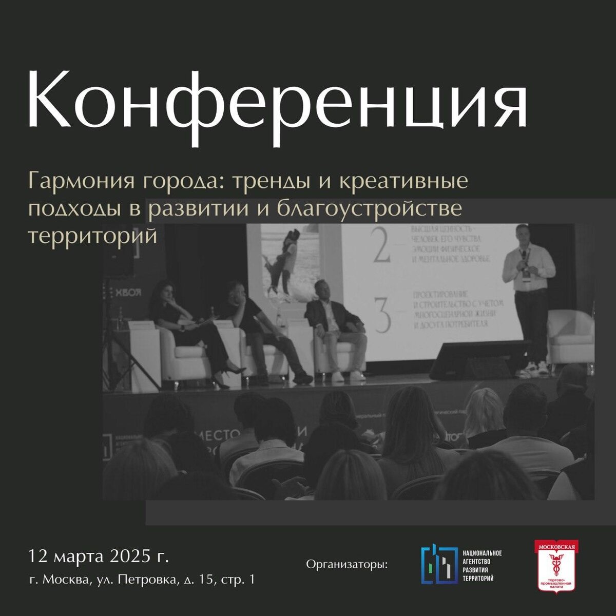 📍 Большой зал МТПП, ул. Петровка, д. 15, стр. 1. ⇒ Конференция посвящена обсуждению современных тенденций в благоустройстве городских пространств, включая общественные зоны, городские парки, территории ЖК, а также развитию сферы креативных производств – изготовителей малых архитектурных форм (МАФов), арт-объектов, уличной мебели, инсталляций и др. Среди гостей мероприятия ожидаются более 100 профессионалов, включая девелоперов, архитекторов, инвесторов, руководителей отраслевых союзов, операторов КРТ, проектировщиков, поставщиков строительных материалов и технических заказчиков. ⇒ Не упустите возможность! Подробности и регистрация на сайте события. По вопросам участия: