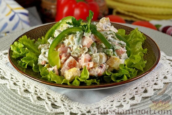 Салат "Каройи" со стручковой фасолью. Вариант венгерского салата с отварным картофелем, яйцами, фасолью, свежими овощами и маринованными огурцами. Заправляется салат соусом тартар. В традиционном рецепте продукты нарезаются кружочками, а в этом – кубиками. Зелёный сладкий перец дополняет овощной салат при подаче.