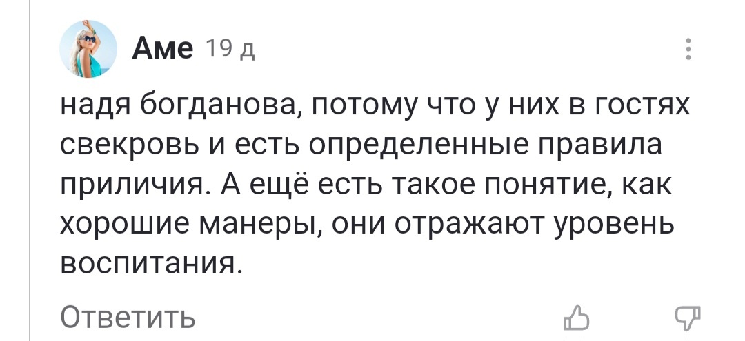 Свекровь приезжает к сыну в другой город, ходит с кислой миной по чужой квартире, потом возвращается к себе и костерит сноху на каждом углу: завтрак лентяйка не готовит, внука зачем-то в сад отдала, хотя из дома работает. И вообще всё делает не то и не так. Как же здорово, что сегодня такую склочную бабенку, по несчастью оказавшуюся матерью любимого мужа, жена не обязана встречать с распростертыми объятьями ради приличия. Раньше было неприлично отказать родственникам, которые решили у вас погостить. Одно дело родители и сестры, но ведь ехали и троюродные внучатые племянницы "поступать", и могли месяцами спать на полу кухни, если других мест не было. Родственников надлежало кормить и развлекать, даже если тебе самой ни поесть, ни поразвлекаться времени не хватает. Поэтому дамам старой закалки непонятно, как это сноха не подскакивает каждое утро и не бежит печь к завтраку оладьи для свекрови. Спала ты ночью или нет, хочешь готовить или не хочешь - обязана, так еще думают некоторые женщин