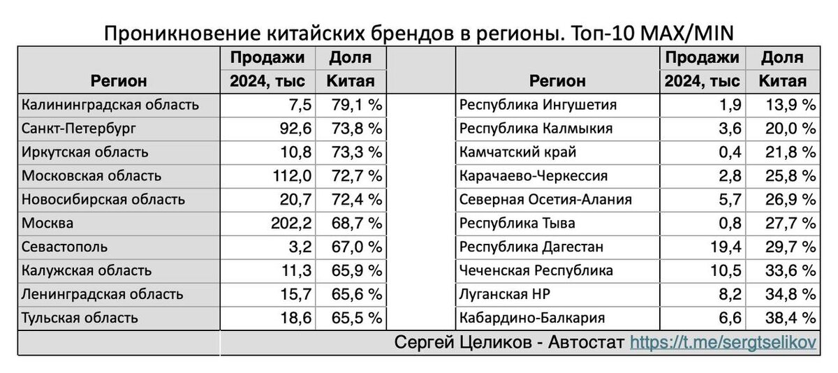 «Китайские автомобили в России: региональный анализ и тренды 2024 года» Приветствую, друзья! Сегодня я хочу поделиться результатами глубокого анализа проникновения китайских автомобильных брендов в регионы России. Цифры и тренды 2024 года оказались весьма интересными, и я постараюсь раскрыть ключевые закономерности. Поехали! --- ### Основные выводы: 1. Средняя доля китайских брендов в России — 58,3%. Это впечатляющий показатель, который говорит о том, что китайские автомобили стали не просто альтернативой, а полноценным лидером рынка. Однако их доля сильно варьируется в зависимости от региона. 2. Обратная зависимость с LADA. В регионах, где доля LADA ниже, китайские бренды чувствуют себя особенно уверенно. Например, в Москве и Санкт-Петербурге, где LADA занимает менее 20% рынка, китайские марки активно заполняют нишу. В среднем по стране рынок делится так: - Китайские бренды: 60% - Российские (в основном LADA): 30% - Прочие (корейские, европейские, японские): 10% 3. Бедные регионы — сл