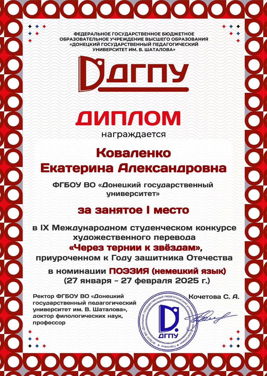 С 27 января по 27 февраля в Донецком государственном педагогическом университете им. В. Шаталова состоялся IX Международный студенческий конкурс художественного перевода «Через тернии к звёздам», приуроченный к Году защитника Отечества. В номинации ПОЭЗИЯ (немецкий язык) студенты кафедры германской филологии ФИЯ заняли призовые места: первое место – Екатерина Коваленко (3 курс, руководитель – доц. Петрищева Е.И.), второе место – Елизавета Селезень (4 курс, руководитель – доц. Петрищева Е.И.). Поздравляем студентов и их руководителя с победой и желаем новых достижений, позитивного настроя и творческого вдохновения!