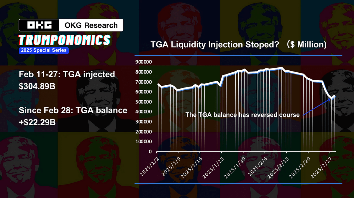 Одно слово Трампа дергает нервы крипторынка, имея довольно значительное значение "успех или провал". В 2025 году OKG Research, особенно в рамках темы "введение в Трамповую экономику", автор будет продолжать отслеживать влияние правительства Трампа 2.0 на рынок криптовалют. В предыдущем материале этой темы (новый раунд ликвидности на подходе — сможет ли крипторынок воспользоваться этим, чтобы достичь новых высот?) мы предложили рынку сосредоточиться на настоящей ликвидности (в краткосрочной перспективе можно обратить внимание на TGA), а не на рыночных новостях и мнениях, и указали, что без настоящей ликвидности "пустые разговоры" о росте валюты не могут быть длительными. Более того, согласно последним официальным данным инвесторов США, с 28 февраля TGA прекратил вливание ликвидности в рынок, что привело к тому, что TGA в общей сложности вливала 304,89 миллиарда долларов на рынок.