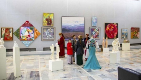 На выставке представлены 285 работ, среди которых живопись, графика, гобелены, скульптура, керамика и ювелирные украшения. В Выставочном центре министерства культуры Туркменистана есть такая традиция: к Международному женскому дню 8 Марта организовывать выставки, в которых свои работы выставляют исключительно представительницы прекрасной половины человечества. В этом году такой возможностью воспользовалась 171 художница. Это — студентки и преподаватели Государственной академии искусств Туркменистана и Туркменского государственного художественного училища, а также свободные художницы. 285 работ, среди которых живопись, графика, гобелены, скульптура, керамика и ювелирные украшения, украсили оба этажа Выставочного центра. О чем эти работы? О цветах, о весне, о материнстве, о туркменских красавицах… Самый часто встречаемый предмет в работах – гранат, который символизирует в туркменском народе плодородие. артина Айгозель Чопановой завораживает изображением печального лица красавицы, наполов