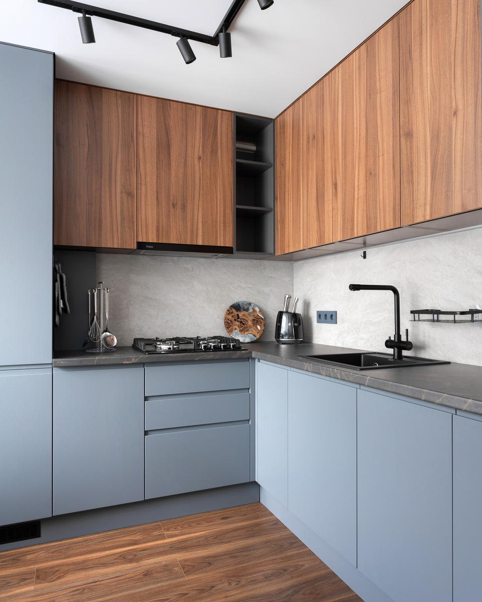 Дизайнеры учитывают все ваши пожелания и особенности помещения, создавая кухню, которая идеально вписывается в ваш интерьер. В данном проекте мы использовали гармоничное сочетание серого и древесного цветов, а также темную столешницу, что подчеркивает современный и элегантный стиль. 2. Качественные материалы и долговечность