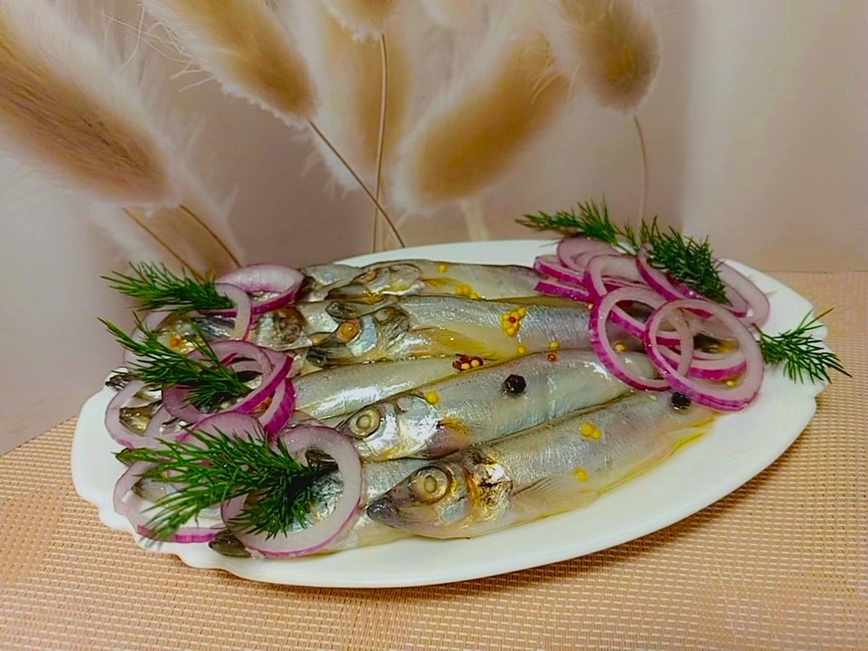 Очень вкусная рыбка, в которой все в меру. 500 г мойвы(разморозить, промыть), 360 г воды, 2 ч.л. без горки, 1 ч.л. сахара без горки, 3 лавровых листа, 3 гвоздики, 10 горошин черного перца, 3 ч.л. готовой зерновой горчицы, 3 ч.л. 9% уксуса. Приготовить маринад. Воду довести до кипения, добавить все специи. Кипятить 5 минут, выключить огонь, остудить. Рыбу сложить в подходящий контейнер, залить маринадом, убрать в холодильник. Оставить на 12 часов. Перемешать рыбу и убрать в холодильник еще на сутки. Через сутки рыба готова. На рыбу положить лук кольцами и полить ароматным раст. маслом. Дать постоять часок и можно подавать. Угощайтесь!!!