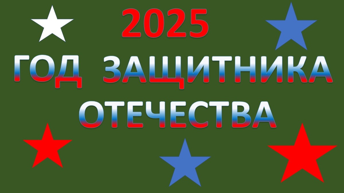 Первый стенд с надписью «2025 — Год защитника Отечества» сразу привлекает внимание. На зелёном фоне ярко выделяются надписи, а красные, белые и синие звёзды создают праздничное настроение.