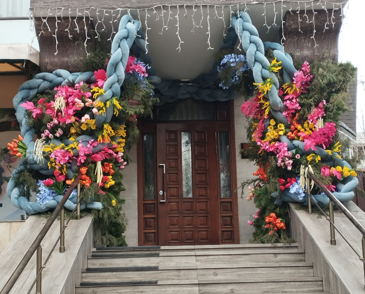 Теперь к заглавному фото. На нем празднично украшенный уже по-весеннему вход в ресторан Какаду, расположенный на втором этаже над супермаркетом Молдова.