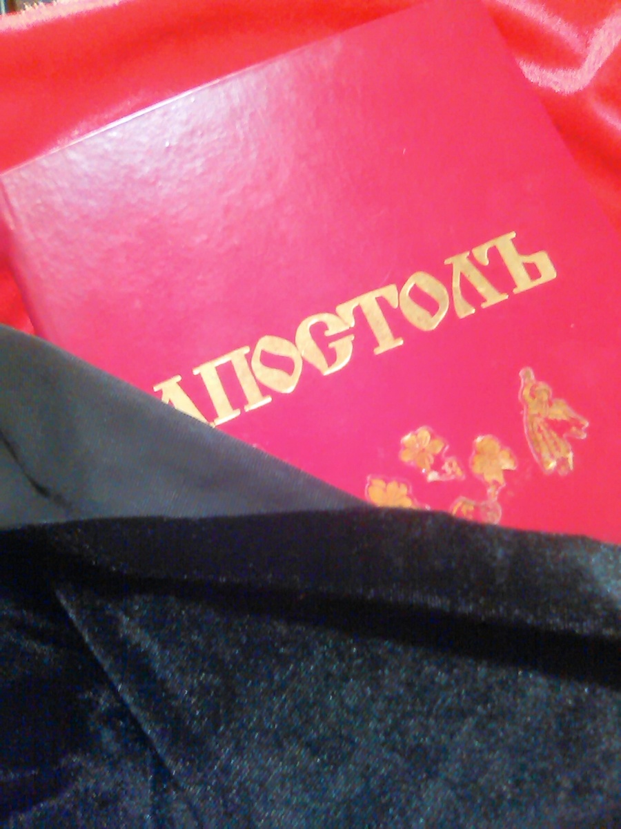 Богослужебное Евангелие или Апостол стоят целое состояние. Напрестольное Евангелие дешевле, чем за 15 тыс. и не найдешь, тоже и Апостол. А есть ли в этом необходимость, когда богослужебные книги с зачалами можно приобрести с пределах 300 р., а для маленьких приходов и скитов это буквально спасение, тем более, что во время великого поста все книги с красным окладом, меняются на черный. Так получается, что имеется два комплекта Евангелие и Апостол - красный и черный. Тогда как заменив только обложку можно использовать один комплект. Рассмотрим на примере апостола: Отмеряем ткань с запасом. Измеряем по высоте и наклеив малярный скотч проводил по высоте, затем складываем и прошиваем отступив от края 3 мм. (Скотч нужен чтобы ткань не растягивалась). Обернув Апостол замеряем подгиб. рассчитывая на некоторую натяжку, но не перетягиваем - иначе не будет натягиваться. Прошиваем по отстрочке и на лицевой стороне пришиваем тесьму в виде символа. Для апостола я выбрал древнейший христианский знак