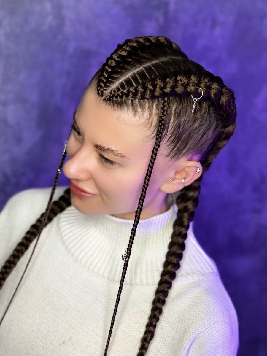 Кого бы из мастеров вы не спросили, любой скажет, что два крупных брейда по голове - одна из самых коварных и непростых причесок с канекалоном. Дело в том, что при всей ее внешней простоте мастерам приходится прикладывать максимум усилий и умений при заплетении. Судите сами, нужно одновременно следить за: Все это гораздо труднее контролировать, если в руках толстые пряди волос. Кроме того, свои волосы надо тянуть из максимально отдаленных и нежных точек головы к самому «телу» брейда. Эти подхваты должны быть не только визуально идеальными, так как они находятся на виду, но и технически правильными, чтобы косы не съехали и не развалились. Еще один нюанс - правильный угол плетения. Если косы расположить ближе к макушке или наоборот спустить ниже, к ушам, то пострадает не только симметрия и общая красота прически, но и появится дискомфорт в период ношения от неправильного расположения брейдов. Поэтому на создание такой прически мы обычно закладываем до 2,5 часов.