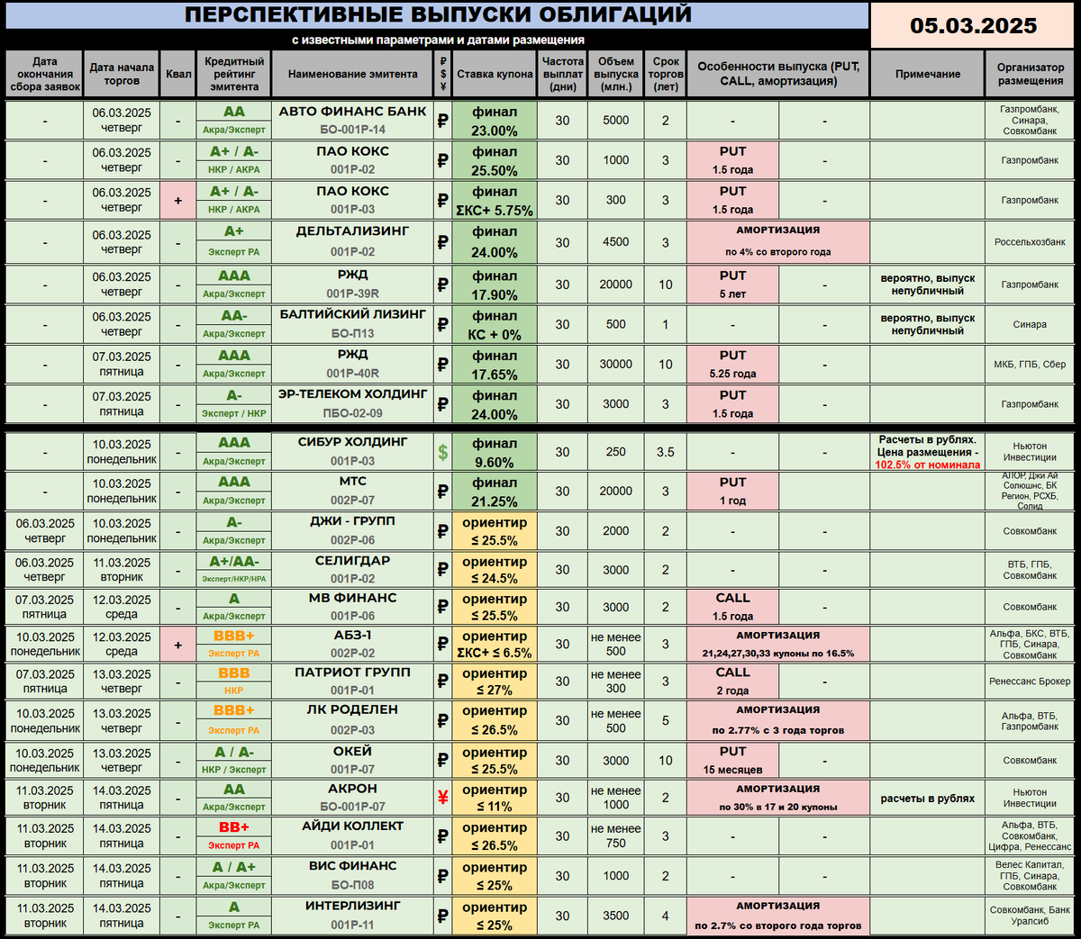 ✌️ Вечерние новости подоспели, дамы и господа! Присоединяйтесь к прочтению, это полезно и увлекательно :) ---------- 🆕 НОВЫЕ РАЗМЕЩЕНИЯ / АНОНСЫ: 🌷 Хитренькая компания НОВОСИБИРСКАВТОДОР (🅰️➖, но такой себе) собралась играть по-крупному. После двух биржевых выпусков и займа в ЦФА вновь понадобились деньги - а кому они не нужны? В связи с этой острой необходимостью в марте нам предложат выпуск БО-03 объемом аж 3 миллиарда рублей. На счастье, минимальная заявка на первичке будет ограничена минимальной суммой в 1,4 миллиона. Трехлетний выпуск оборудован коллом через 1,5 года, а ориентир ежемесячного купона замер на уровне "не выше 26%". Вроде и выше рынка, но компания совсем не без проблем. Организаторы - Совкомбанк и ГПБ, точные даты размещения сообщат позже. 🌷 АЭРОФЬЮЭЛЗ (🅰️ / 🅰️➖) представляет компанию староверов. Почему? В анонсированной новинке серии 002Р-04 заявлены квартальные купоны, мы от них отвыкли. Хочется верить, что не придется привыкать снова! Итак, сбор заявок н