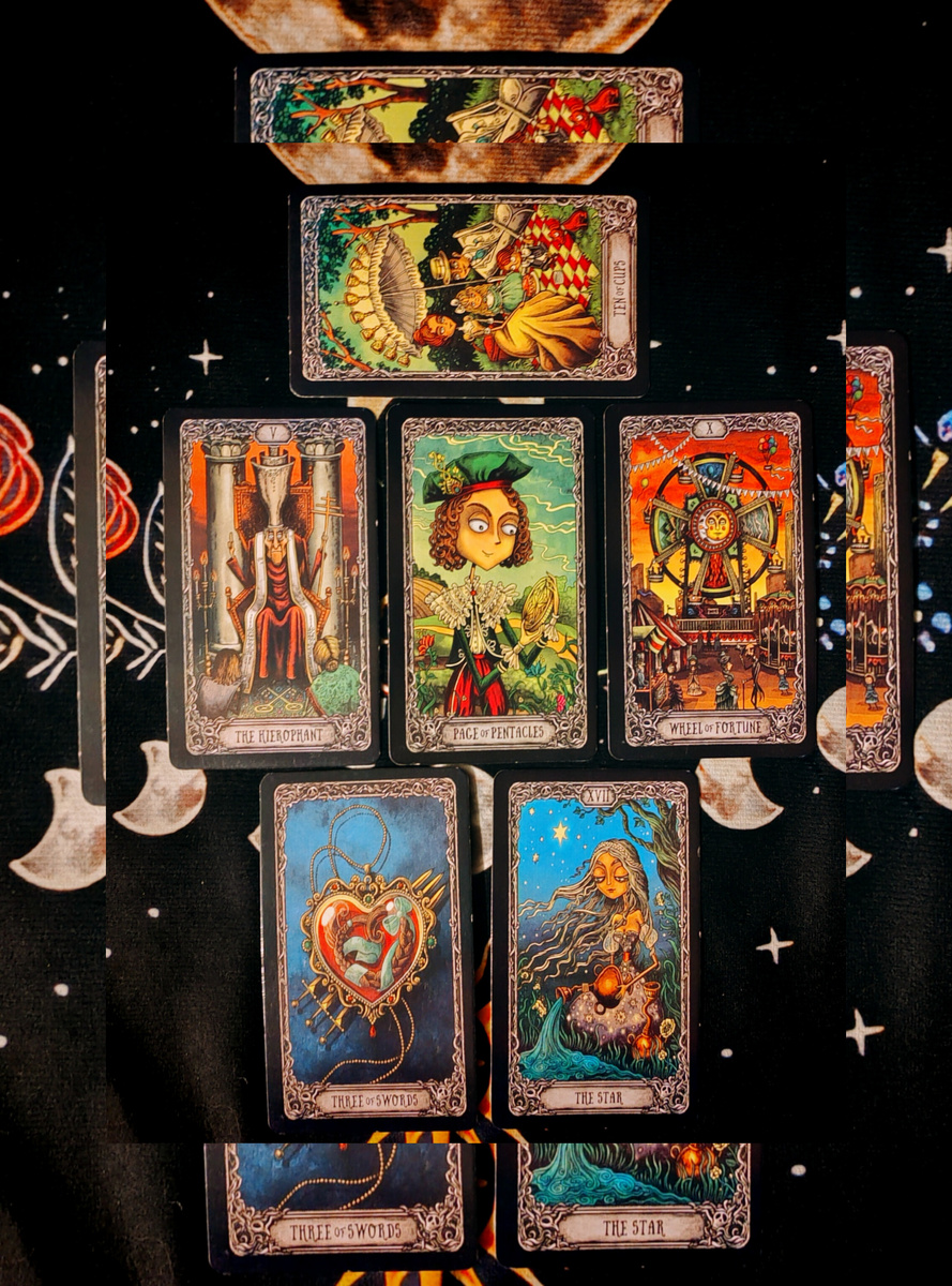 5 старший аркан Иерофант, Паж пентаклей, 10 старший аркан Колесо Фортуны, 3 мечей, 17 старший аркан Звезда.