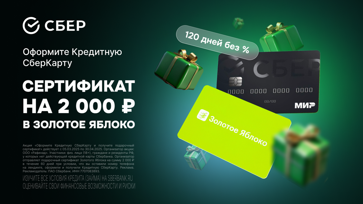 Нужны деньги на подарки, но не хотите переплачивать? Оформите Кредитную СберКарту и получите подарочный сертификат на 2000 ₽ в Золотое Яблоко 💚 🔢Оформить карту по ссылке 🔢Получить карту на руки 🔢Ждать сертификат на 2000 ₽ 🟢Сертификат на 2000₽ в Золотое Яблоко: Побалуйте себя косметикой, парфюмерией или уходом! 🟢120 дней без процентов: Забудьте о переплатах и планируйте свои покупки с умом! 🟢0₽ за обслуживание навсегда: Никаких скрытых комиссий, только выгода! 🟢Кредитный лимит до 1 млн ₽: Решайте финансовые вопросы легко и быстро! 🌱Не упустите шанс порадовать себя и близких! Акция ограничена. Акция от партнера “Рафинад”