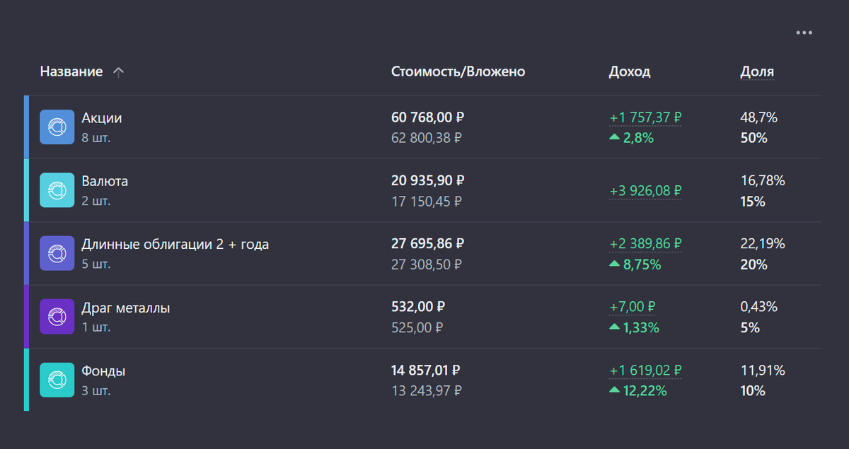 Структура - это как скелет Вашего портфеля, с этого начинается разумное инвестирование на фондовом рынке. Можно сказать - это навигатор в сложном мире финансов. Я не буду никого учить как надо, а на примере своего портфеля попытаюсь объяснить что это такое. На скрине показаны основные категории активов, они могут быть любыми. Для себя я выбрал такие и определил целевые доли по каждой из категорий. Например для акций я определил 50% от всего портфеля, вложено в них 62 800 рублей, а текущая доля 48,7%. Доход по акциям получен за счёт дивидендов, а стоимость ещё находится в минусе. Формирование пенсионного портфеля начинал с нуля и продаж особо не было. В будущем когда портфель станет большим и толстым, я начну продавать лишние активы и перекладывать вырученные деньги в просевшие категории, но это пока в теории. Сейчас мне вполне хватает ежемесячных пополнений на 8 400 рублей для поддержания баланса по активам. Акции в свою очередь поделены на 8 секторов экономики, можно хоть 20 сделать,