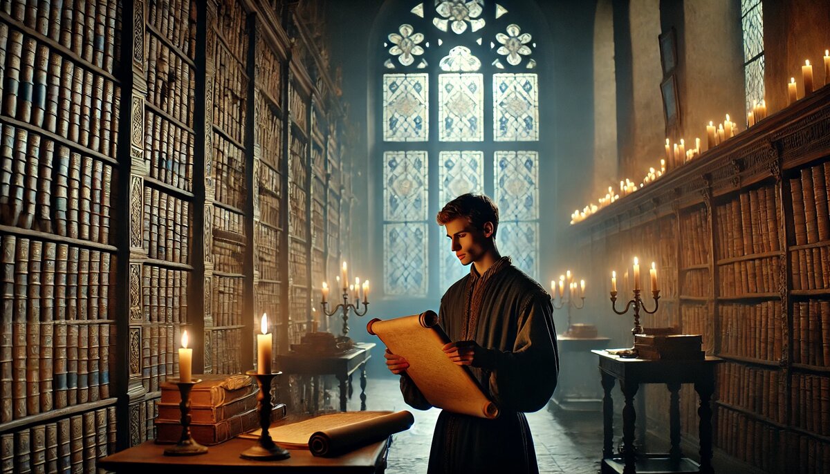 Остановившись возле тяжёлой дубовой двери, монах достал старинный ключ и осторожно открыл её. Перед Арманом предстал огромный зал, стены которого были заставлены книгами и древними пергаментами.
