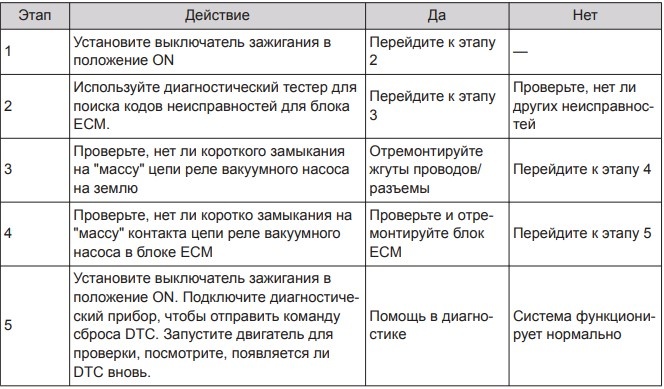 Описание кода неисправности: низкое напряжение в цепи управления реле вакуумного насоса тормозной системы. Условия возникновения кода неисправности: ошибка в ходе самодиагностики.
