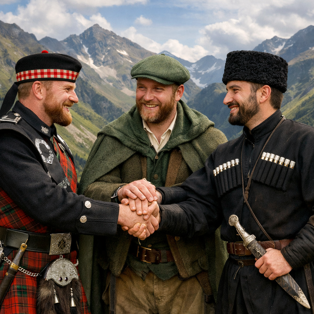 Горцы Северного Кавказа, Ирландии и Шотландии, несмотря на географическую удалённость, имеют ряд интересных параллелей в своей истории, культуре и политическом развитии. Эти связи, хотя и не всегда прямые, основаны на общих чертах горского уклада жизни, борьбе за независимость и сохранение традиций. В данной статье мы рассмотрим ключевые аспекты, которые сближают эти народы. 1. Горский образ жизни И горцы Северного Кавказа, и горцы Ирландии и Шотландии исторически жили в труднодоступных горных регионах, что формировало их уникальный уклад жизни. Горные условия способствовали развитию клановой системы, где семья и род играли ключевую роль в социальной организации. На Кавказе это выражалось в тейповой системе (например, у чеченцев и ингушей), а в Шотландии и Ирландии — в клановой структуре (например, кланы Маклауд, Макдональд или О’Нил). 2. Борьба за независимость И те, и другие горцы на протяжении веков боролись против внешних захватчиков. Северный Кавказ стал ареной длительного сопроти