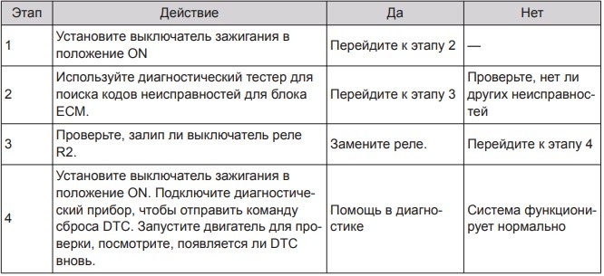Определение кода неисправности: не отключается реле R2 стартера. Условия появления кода неисправности: сигнал обратной связи стартера можно обнаружить, подав проверочный пусковой импульс при заблокированном приводе.