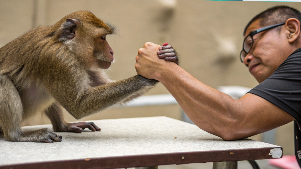 Если бы вы встретили обычную макаку и решили помериться с ней в армрестлинге, вы бы проиграли. А если бы перед вами оказался шимпанзе весом 60 кг? Он мог бы просто оторвать вам руку. Почему? «Шимпанзе всю жизнь передвигаются, бросая своё тело через ветки. Попробуйте взять гирю 30 кг и закинуть её на пять метров – а теперь делайте это сотни раз в день.» Их мышцы развиваются не для того, чтобы выглядеть внушительно, а для выживания в мире, где сила – это всё. Наши предки были мощными созданиями. Они могли сражаться, лазить по деревьям, отбиваться от хищников. Но когда на них нападал саблезубый тигр, они не могли ему ничего противопоставить. «Если бы он оторвал тигру ухо – это не помогло бы. Тигру всё равно, он продолжил бы охоту. А когда антилопу догонять будет нечем, он просто умрёт с голоду.» То есть австралопитек мог защититься, но не мог атаковать. Он не был охотником – он был целью. Когда люди освоили оружие, они перестали быть жертвами. С этого момента никакой зверь уже не мог с н
