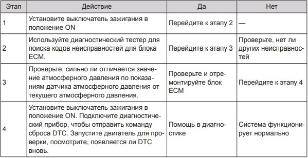 Описание кода неисправности: слишком низкие значения датчика атмосферного давления. Описание кода неисправности: слишком высокие показания датчика атмосферного давления. Описание кода неисправности: ошибка самодиагностики чипа атмосферного давления в блоке ECM. Описание кода неисправности: низкое значение датчика атмосферного давления в момент запуска двигателя. Описание кода неисправности: высокое значение сигнала датчика атмосферного давления в момент запуска двигателя. Описание кода неисправности: значение сигнала атмосферного давления значительно выше предела допустимых значений. Описание кода неисправности: значение сигнала атмосферного давления ниже предела допустимых значений.