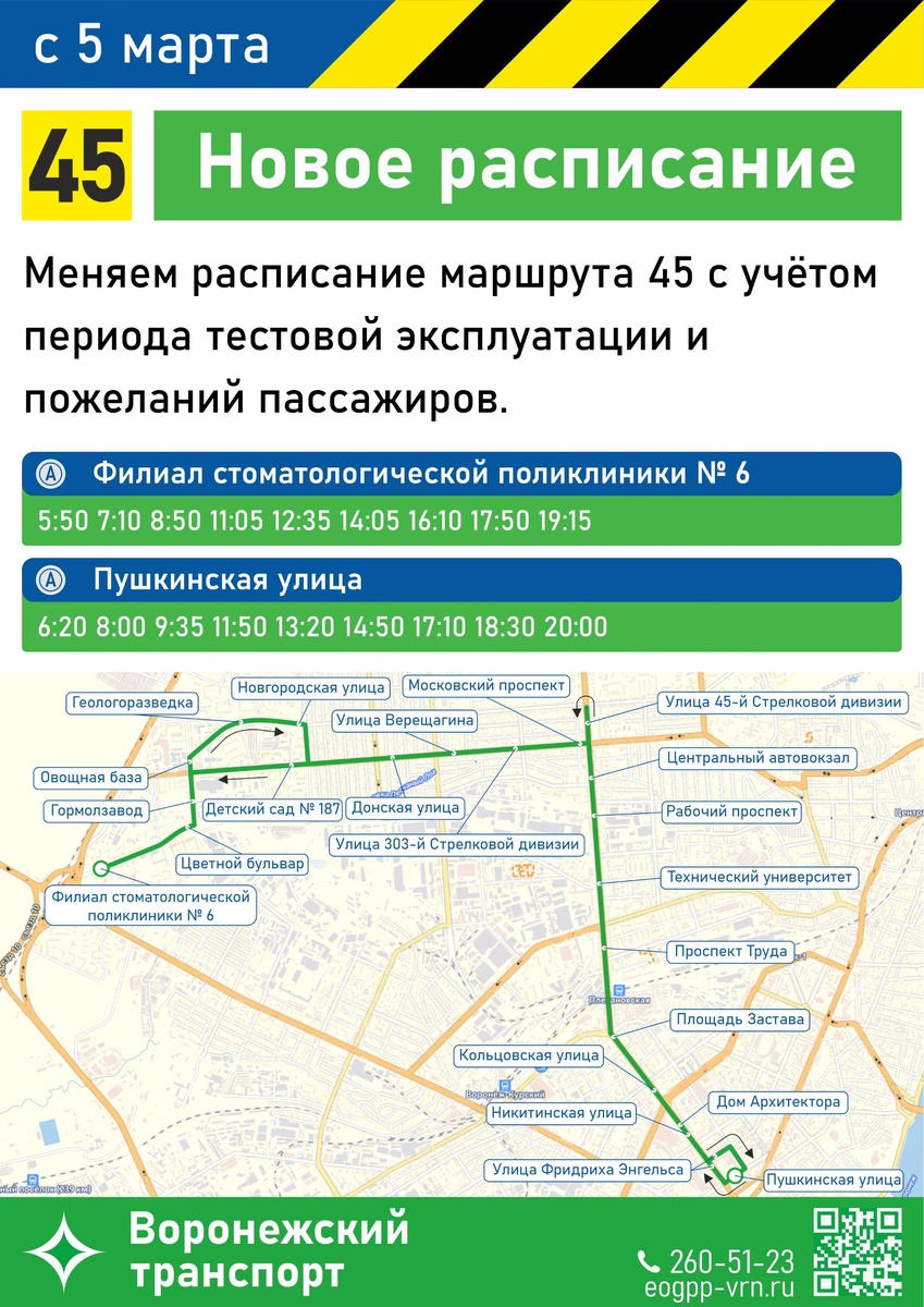 В Воронеже с сегодняшнего дня, 25 февраля, изменилось расписание, по которому будут ездить автобусы №45. Об этом рассказали в пресс-службе городского управления транспорта. Этот маршрут связывает филиал стоматологической поликлиники № 6 с центральной частью города – улицей Пушкинской – через улицу 45-й Стрелковой Дивизии и Московский проспект. Теперь из Коминтерновского района он будет уезжать в 5:50, 7:10, 8:50, 11:05, 12:35, 14:05, 16:10, 17:50 и 19:15. Из центра автобус будет уезжать в 6:20, 8:00, 9:35, 11:50, 13:20, 14:50, 17:10, 18:30, 20:00. Автобус «Воронежпассажиртранса» будет курсировать по данному расписанию. Напомним, на линии ездит один автобус большого класса. Дмитрий Амелин