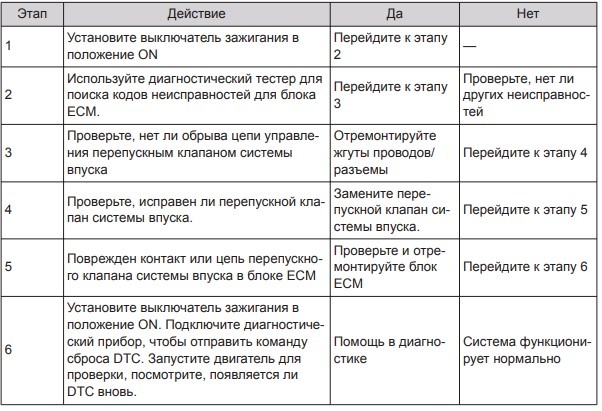 Определение кода неисправности: механическая неисправность перепускного клапана системы впуска. Условия появления кода неисправности: количество колебаний давления перед дроссельной заслонкой превышает пороговое значение.
