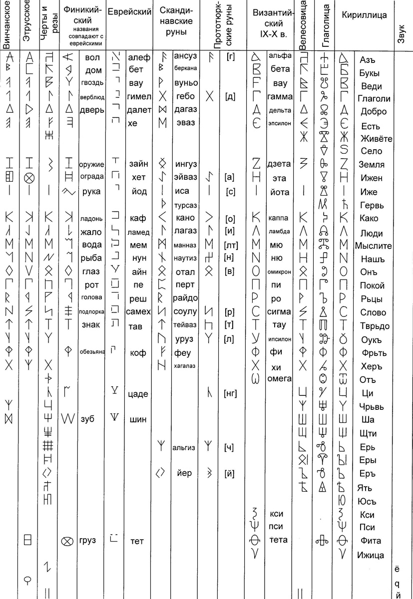 Стирание исторической памяти русского народа, памяти о его древнейших корнях было, по большому счёту, нужно Христианской церкви для стирания памяти о контактах с внеземной Сверхцивилизацией. Перед ВОСР 75% населения по последней дореволюционной переписи было ПОЛНОСТЬЮ неграмотным, то есть не умело ни читать, ни писать. Основная масса народа, была превращена Православной церковью и российским государством в безграмотное общество. Более того, чтобы сведения о древней истории не передавались изустно, уничтожались гусляры сказители - хранители устных народных преданий-былин, и даже сам этот музыкальный инструмент - гусли, был подвергнут запрету и уничтожению в России. Здесь приводится сравнительная таблица кириллицы, глаголицы с алфавитом Велесовой книги и другими древними алфавитами. К сожалению, ошибки в таблице вполне возможны. Данные в разных источниках разнятся. Это неизбежно уже потому, что письменность любого народа со временем претерпевала изменения.