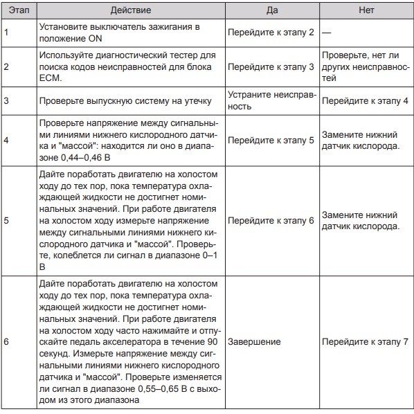 Описание кода неисправности: возрастной износ нижнего кислородного датчика (обогащенная смесь). Условия появления кода неисправности: пониженное напряжение нижнего кислородного датчика в течение длительного времени. Выход из диапазона 0,55–0,65 В" означает, что обнаруженное напряжение было выше 0,55–0,65 В, но также было ниже 0,55–0,65 В