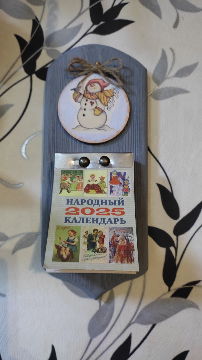 В этом году мы решили возобновить традицию наших бабушек- вешать отрывной календарь. Среди множества предложенных был выбран Народный календарь. Здесь и советы по дому , и ребусы- загадки, и приметы. Каждое утро начинается с нового листка. Это уже ритуал, кто первый просыпается, тот и отрывает, а прочитав, оставляет на столе для другого. Часто, за ужином, обсуждаем прочитанное. Можно считать, что традиция прижилась. Для календаря я изготовила специальный подвес. Особенность была в том, что на крючок вешается картинка с временем года. Всю зиму у нас висел снеговичок, но пора ему уступить место подснежникам. Заготовки другой у меня не нашлось, поэтому я просто перевернула эту и загрунтовала. Зато нашлась декупажная карта, с подходящим по размеру рисунком. Приклеяла на клей ПВА. Губкой покрасила края краской оливкового цвета. И оттенила золотой. Когда просохло покрыла лаком. Время подснежников наступило. А погода преподносит свои сюрпризы. Каждое утро обнаруживаем землю укрытую снегом