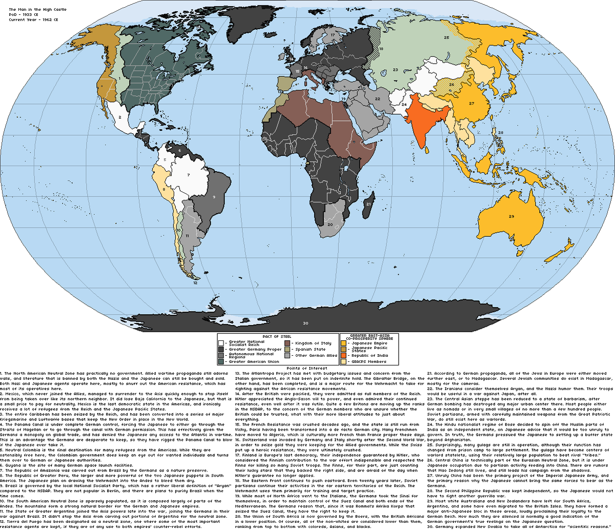 "Статья из мира "Человека в высоком замке", созданная на основе карт мира, которые мы видим в сериале от Amazon. Если вы являетесь поклонником этого произведения, то вам точно известно, о чем идет речь, поэтому я не стану утруждать себя объяснением предыстории. В основном я остался верен карте, представленной в сериале, включая даже технические манипуляции по преобразованию проекции Меркатора в проекцию Робинсона. Однако я внес несколько изменений. Название "Большой фашистский рейх" для нацистов в Северной Америке кажется мне бессмысленным, поэтому я переработал этот момент: теперь существует национал-социалистическая империя, которая теоретически подчиняется Германии, но фактически управляется местными национал-социалистическими партиями (не являющимися филиалами НСДАП, которая остается исключительно немецкой организацией). Эта империя отличается от самой Большой Германии. Кроме того, я добавил независимый союз Италии и Испании, хотя их существование как самостоятельных государств в сериале вызывает определенные сомнения. Также я отдал Антарктиду под контроль немцев, поскольку, хотя в сериале Антарктика обозначена как нейтральная территория, я предполагаю, что нацисты вряд ли согласились бы с таким положением дел. Я еще не досмотрел два сезона, поэтому могу внести дополнительные изменения, например, касательно Атлантропы. Это был своего рода "выстрел в темноту"; если я допустил ошибку, пожалуйста, дайте мне знать."