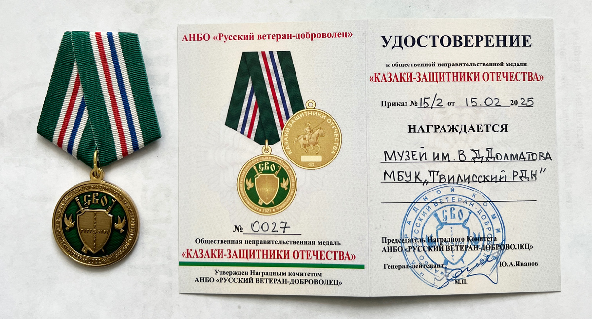 Музей им Долматова награжден медалью «КАЗАКИ-ЗАЩИТНИКИ ОТЕЧЕСТВА» НАГРАДНЫМ КОМИТЕТОМ АНБО «РУССКИЙ ВЕТЕРАН-ДОБРОВОЛЕЦ»
