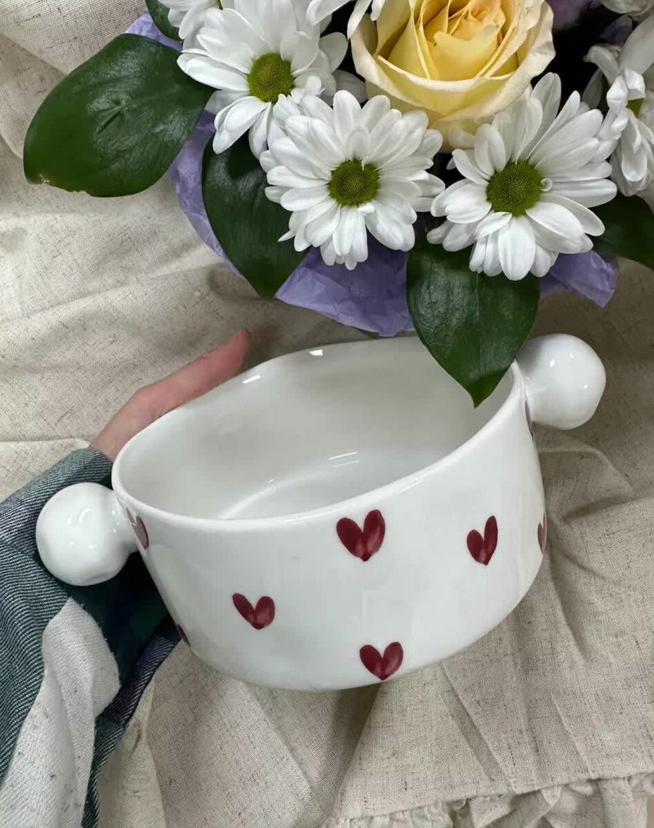 Такой милый салатник отличный способ привнести нотку романтики в повседневные трапезы. Он выполнен из качественного материала, который обеспечивает долговечность и легкость в уходе. Такой салатник станет не только функциональным, но и стильным элементом сервировки стола. Очень интересно выполнен, с ручками.