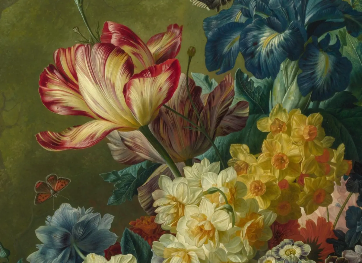 Другие знаменитые сорта включали красно-желтые Viseroi и сиренево-фиолетовые цветы с белыми полосами. Художники того времени изображали тюльпаны отдельно или вместе с другими цветами, создавая символически насыщенные композиции, не всегда соответствующие реальным срокам цветения.