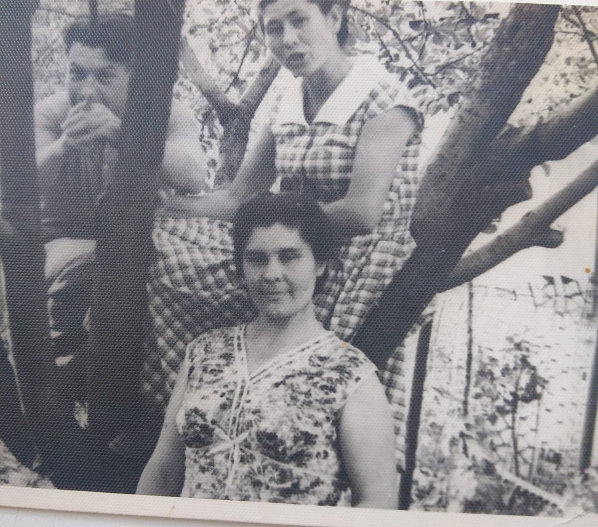 Одна из немногих фотографий, которая случайно попала ко мне после папиной смерти. На переднем плане моя тётя Люся, папина старшая сестра. Вверху её муж, дядя Лёня и моя мама Шура. На маме и на тёте платья, которые шила мама. Она шила очень хорошо, и у неё уже тогда была электрическая швейная машинка. Не знаю, почему, имея такой талант, мама жила очень скромно. Шила она очень хорошо. А в то время, когда в магазинах готовой одежды почти не было, шитьём можно было очень хорошо зарабатывать.