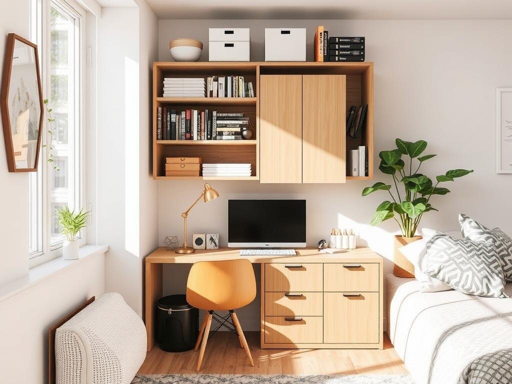- Многофункциональная мебель: Столы и диваны с подъемными крышками или встроенными ящиками.
