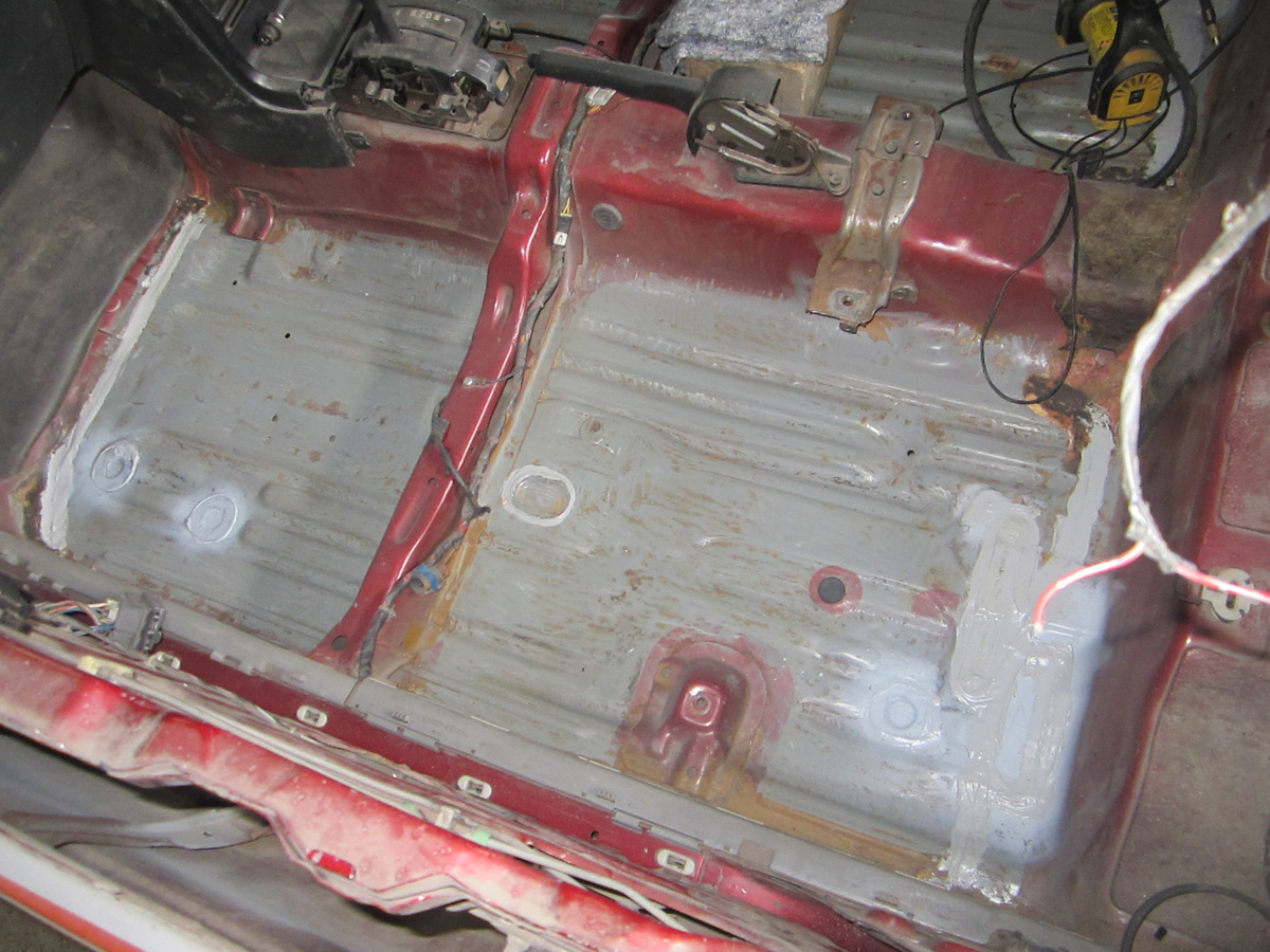 После того, как собрал заднюю часть в кучу, я решил отдохнуть от высококвалифицированного труда и занялся тупой работой — освободил пол от желтой краски и заварил пару дыр в полу. Краску грел феном и соскребал металлическим шпателем. Краска слезла относительно легко. Дыры были в ногах задних пассажиров, в районе шва, по которому пол стыкуется с задней частью. Фотографий процесса нет. Есть только парочка итоговых.